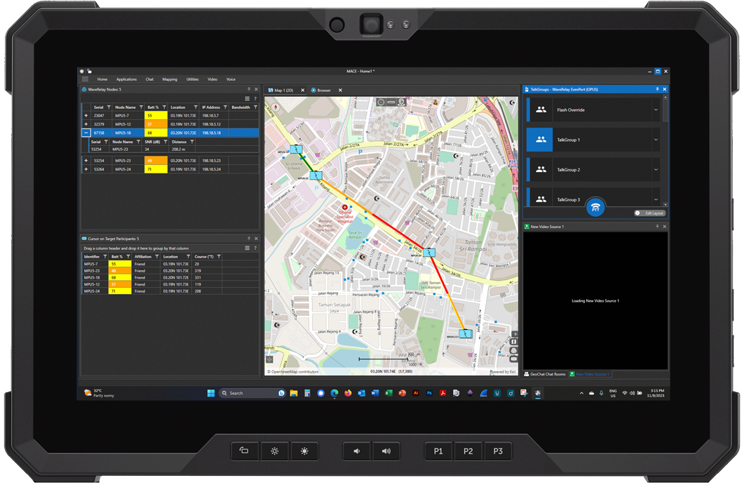 MACE combines the key elements that you require to gain insight into all your operational elements, providing access to local and distributed networked elements. MACE provides voice, video, chat and situational awareness through a single pane of glass, simplifying command and control.